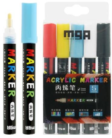 A készlet 5 alap akril színt tartalmaz (piros, kék, sárga, fehér, fekete). A 2 mm-es csúcsszélességű dekoratív marker alkalmas olyan felületek festésére, mint: kő, kerámia, porcelán, üveg, fa, textil, vászon, fém, fa, műanyag, polimer agyag stb. Erősen pigmentált akrilfesték. Gyorsan szárad, így tartós, fényes felületet hoz létre világos és sötét felületeken. A ti