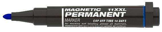 Alkoholos marker ICO Permanent 11 XXL mágnessel kék Műanyag, üveg, fém, fa, illetve szinte minden felület feliratozására, jelölésére alkalmas, alkoholbázisú festékkel töltött permanent marker. Speciális tulajdonsága, hogy 14 napig kupak nélkül sem szárad be. A marker végén lévő záródugóban elhelyezett mágnes révén, acél felületeken rögzíthető. Gyorsan száradó