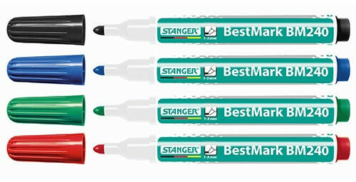 Táblamarker Stanger BM240 kerek 1-3 mm 4 db-os klt. Vonalvastagság: 1–3 mm Írásszín: 4 db-os készlet fehér táblákon használható marker szárazon törölhető majdnem minden felületről kerek hegy