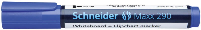 TÁBLA- ÉS FLIPCHART MARKER 2-3 MM KEREK VÉGŰ SCHNEIDER MAXX 290 KÉK Univerzális marker flipchart táblákhoz és papíralapú felületekhez, vízálló szinte szagtalan, a fehértáblákról szárazon törölhető, oldószermentes. Kupak nélkül 2-3 napig nem szárad be. Katalóguskód: 36350
