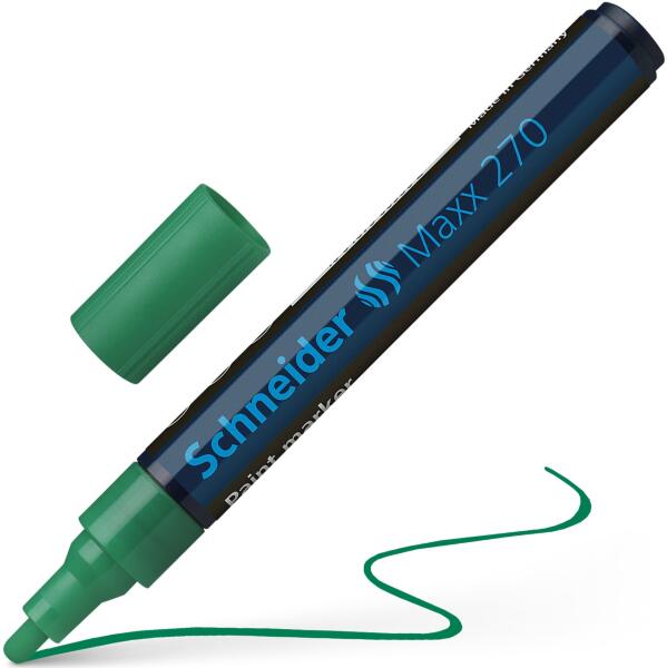 Schneider Maxx 270 festékmarker, 1-3 mm, zöld A Schneider Maxx 270 festékmarker különböző területeken való használatra, a műszakitól a képzőművészetig. Szinte bármilyen felületen használható, legyen az csiszolt vagy fényes: fa, műanyag, üveg, fém, kerámia, papír, karton, stb. A festék ellenáll a víznek, a törlésnek, a mechanikai igénybevételnek és a magas hőmérs