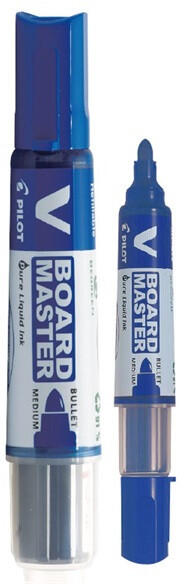 Pilot BeGreen V-Board Master kék táblamarker A Pilot BeGreen V-Board Master egy cserélhető patronos, folyékony tintával töltött táblamarker. Az újfajta tintatovábbító rendszer lehetővé teszi az azonnali írást, rázás vagy pumpálás nélkül. A V-Board Master marker újrahasznosított műanyag felhasználásával készült, mellyel a Pilot csökkenti ökológiai lábnyomát az ú