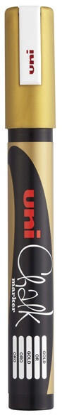 Uni Chalk PWE-5M arany folyékony krétafilc - Vízbázisú dekor krétamarker (folyékony kréta), kúpos heggyel - Ellenáll az esőnek, vizes ronggyal viszont könnyen letörölhető - Fekete, világitó táblán jól látható, a fluoreszkáló színeknek köszönhetően - Típus: PWE-5M, gömbhegyű 1,8-2,5 mm