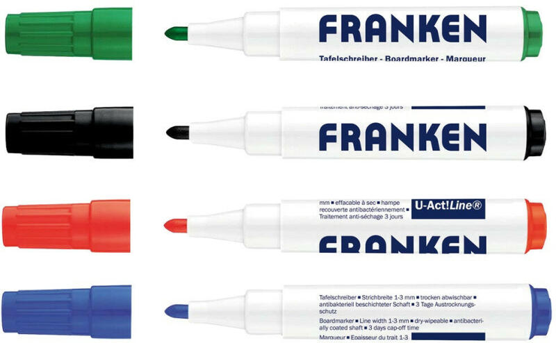 Táblamarker 2-6mm kerek, antibakteriális, mágneses, 10-es klt FRANKEN Fehértáblára való írásra, rajzolásra alkalmas marker. Az írás szárazon letörölhető, fényálló és gyorsan száradó. Speciális hegye folyamatos írásképet biztosít. Kerekített csúccsal, légmentesen záró kupakkal. Vonalvastagság:2 - 6 mm. 10 különböző szín a csomagban. (piros, zöld, kék, sárga,