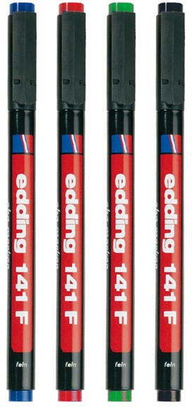 Edding 141 F OHP 4db-os 0,6mm vegyes színű permanent marker - Írásvetítő fólia, fólia, műanyag, üveg, fém, fa, szinte minden felület feliratozására, jelölésére alkalmas - OHP-permanent festékkel töltött marker, precíziós, fémfoglalatú írócsúccsal - Gyorsan száradó, színtartó festék, írásképe törlés- és vízálló - A festék nagy fényáteresztő képességgel