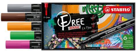 A STABILO FREE Acrylic Marker termékcsaláddal szinte korlátlanul tervezhet és személyre szabhat. A markerek három, gondosan kiválasztott tokváltozatban és akár 20 borítószínben kaphatók. Átlátszatlan és fényálló pigmentált akrilfesték, amely szinte minden felületre alkalmas, a papírtól a kőig a kerámiáig, műbőrig és fáig. Mindenki szabadjára engedheti kreativitás