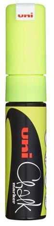 Uni Chalk PWE-8K fluor sárga folyékony krétafilc - Vízbázisú dekor krétamarker (folyékony kréta), vágott heggyel - Ellenáll az esőnek, vizes ronggyal viszont könnyen letörölhető - Fekete, világitó táblán jól látható, a fluoreszkáló színeknek köszönhetően - Típus: PWE-8K, vágott hegyű 8 mm