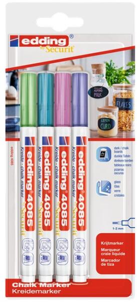 Az Edding 4085 krétamarker készletet ideiglenes tervezésre, dekorálásra és írásra tervezték nem porózus felületeken, például ablakokon, sötét táblákon, üvegen, plexin és tükrökön.