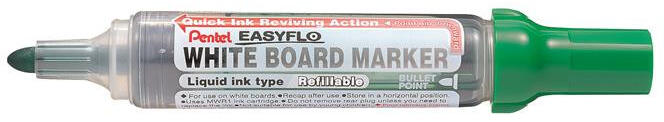 Táblamarker, 6 mm, kúpos hegy, PENTEL "Easyflo", zöld A folyadéktartálynak köszönhetően folyamatos a tinta áramlás és soha nem szárad ki. -gömbhegyű, vízbázisú táblamarker -használat előtt rövid ideig tartsa heggyel lefelé a markert -utántölthető -acryl szálas, mindig alaktartó és strapabíró hegy -93%-ban újrahasznosított anyagból készült, eleme a Pentel Recyolog