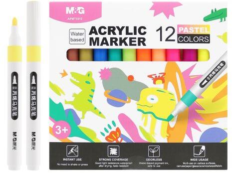 12 akril marker készlet széles felhasználási lehetőséggel. - vászonra, papírra, üvegre, kerámiára, fára, szövetre - pasztell színek ellenállnak a száradás utáni fakulásnak, vízállóak - azonnali használat (nem kell rázni vagy megnyomni) - vízbázisú pigment