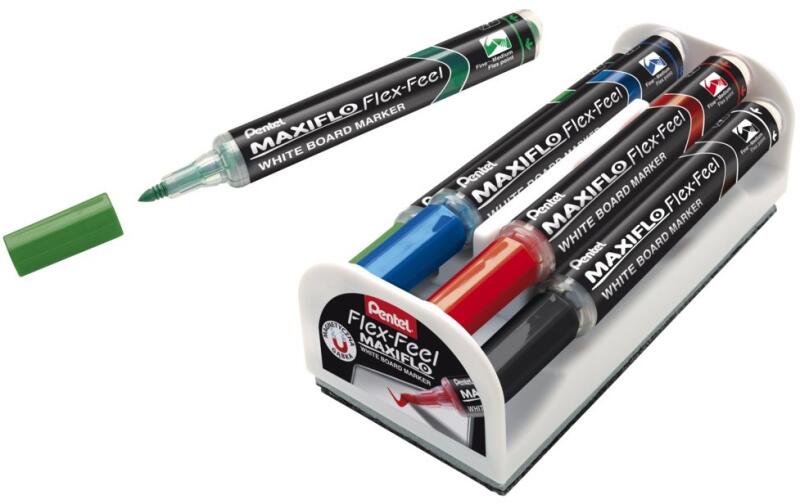 Táblamarker+törlő szivacs 1-5mm, hajlékonyhegyű, PENTEL Maxiflo Flex Feel 4 db-os klt