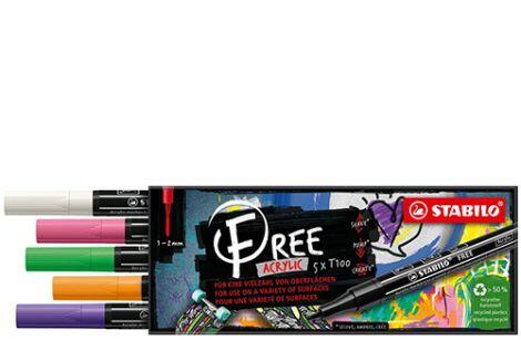A STABILO FREE Acrylic Marker termékcsaláddal szinte korlátlanul tervezhet és személyre szabhat. A markerek három, gondosan kiválasztott tokváltozatban és akár 20 borítószínben kaphatók. Átlátszatlan és fényálló pigmentált akrilfesték, amely szinte minden felületre alkalmas, a papírtól a kőig a kerámiáig, műbőrig és fáig. Mindenki szabadjára engedheti kreativitás