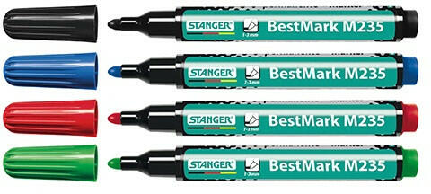 Marker Stanger M235 permanent kerek 4 db-os klt. Típus: M235 Hegy: kerek Írásvastagság: 1–4 mm Írásszín: 4 db-os készlet permanent festékkel töltött marker alkoholbázisú műanyag, fém-, üveg- és fafelületekre