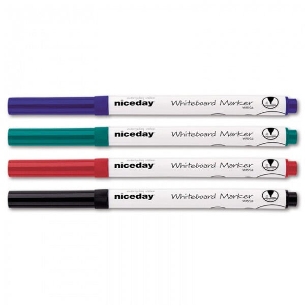 Niceday kerek vékony hegyű 4db-os vegyes színű táblamarker készlet - Szárazon törölhető táblamarker fehér táblákra és laminált felületekre - A praktikus, klippes kupak színe megegyezik a tinta színével - Kerek vékony hegy - Írásvastagság: 1 mm - Szín: 4 színű készlet