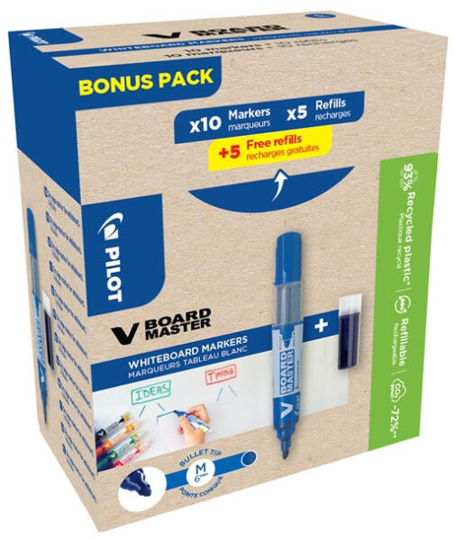 TÁBLAMARKER 2,3MM KEREK UTÁNTÖLTHETŐ MEDIUM V-BOARD MASTER 10+10 PILOT KÉK Pilot V-Board Master M utántölthető marker készlet 10 db markerrel és 10 db betéttel. A PILOT műszaki innovációinak egyike a cserélhető patronos, folyékony tintával töltött táblamarker. Az újfajta tintatovábbító rendszer lehetővé teszi az azonnaliírást, rázás vagy pumpálás nélkül. Biztosí