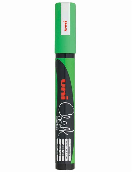 Uni Chalk PWE-5M fluor zöld folyékony krétafilc - Vízbázisú dekor krétamarker (folyékony kréta), kúpos heggyel - Ellenáll az esőnek, vizes ronggyal viszont könnyen letörölhető - Fekete, világitó táblán jól látható, a fluoreszkáló színeknek köszönhetően - Típus: PWE-5M, gömbhegyű 1,8-2,5 mm