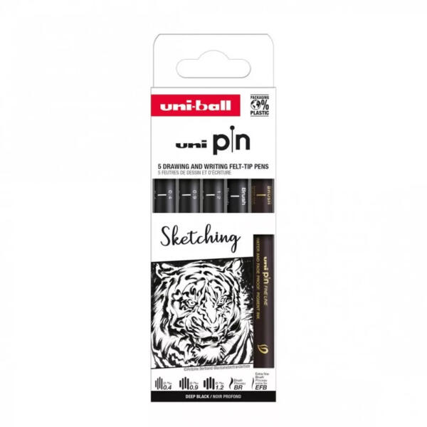 UNI PIN 200 5 darabos rajzmarker készlet Sketching (Black Brush, Extra Fine Brush, fekete rajzmarker: 0,4/0,9/1,2 mm) A készlet kiváló művésztollakat tartalmaz (különböző vonalvastagságok). A finelinerek fakulásálló Super Ink tintát tartalmaznak, így alkotásaid tartósak maradnak. A finom hegyű toll homogén, tömör és tiszta vonalat hoz létre. A létrehozott vonalak száradá