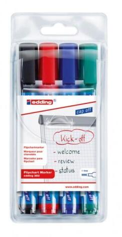 Marker vízbázisú tintával és a Cap off funkcióval, amely megakadályozza a tinta kiszáradását még több napig is, ha a toll nyitva van. Flipchart lapok és egyéb papírlapok címkézésére. Újratölthető FTK 25 tintával, amely nem kerül át a papír másik oldalára. A csúcs le van vágva, a nyom szélessége 1-5 mm. 4 db-os szett színkeverékben. Szín: 4 szín keveréke Nyomsz