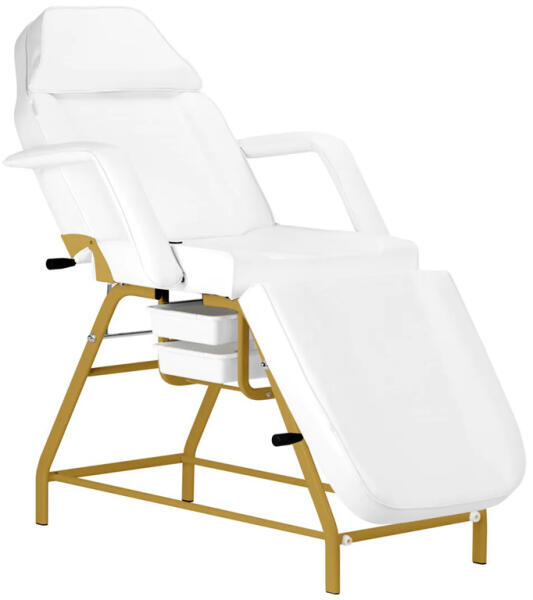 A praktikus fiókokkal ellátott BeautyOne 557G White kozmetikai szék, ideális kozmetikai kezelésekhez, szőrtelenítéshez, sminkeléshez és masszázshoz. A gyönyörű kivitelezésű állítható kozmetikai ágy alkalmas professzionális használatra kozmetikai és masszázsszalonokban egyaránt. A szék támlái állíthatóak, használható fotelként vagy masszázs kezelésekhez vízszint