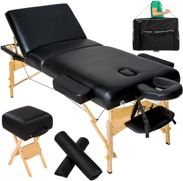 A tectake vállalat egy csúcsminőségű, fényűző és nagyon stabil masszázságyat kínál professzionális masszőröknek. Az ágy praktikus összecsukási rendszeren alapul, amely néhány másodperc alatt lehetővé teszi a gyors szét- és összeszerelést. Az ágyat nagy stabilitás, biztonság és kényelem jellemzi, amelyet a 10 cm vastag, Oxford 600D anyagból készült kárpit biztos