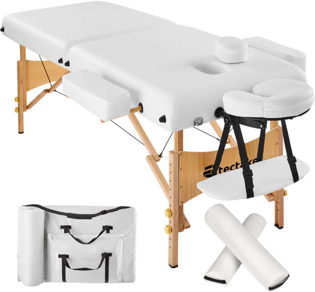 A tectake vállalat egy csúcsminőségű, elegáns és nagyon stabil masszázságyat kínál professzionális masszőröknek. Az ágy praktikus összecsukási rendszeren alapul, amely néhány másodperc alatt lehetővé teszi a gyors szét- és összeszerelést. Nagy stabilitás, biztonság és kényelem jellemzi, amelyet a 7,5 cm vastag, Oxford 600 D anyagból készült kárpit biztosít. Tök