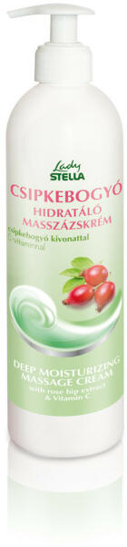 Lady STELLA Csipkebogyó hidratáló masszázskrém 500 ml csipkebogyó kivonat ceramid kamilla hidroviton Intenzív hidratáló, regeneráló, frissítő masszázskrém extra száraz és érzékeny bőrre A csipkebogyó természetes C- és egyéb vitaminokban (B1-, B2-, K-, P-), ásványi anyagokban, nyomelemekben és bioflavonoidokban gazdag Ceramid erősíti a bőr barrier funkcióit, helyreál