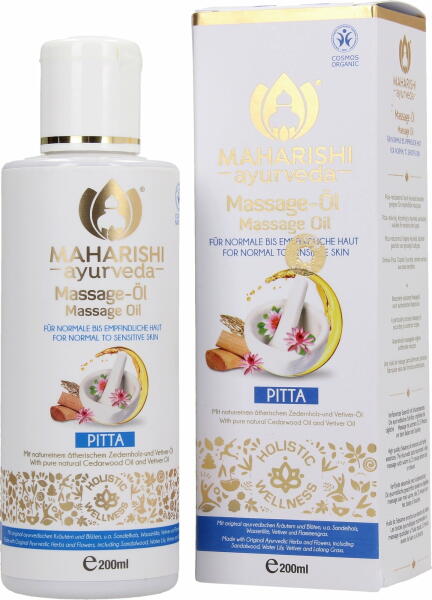 Friss, fanyar illatú masszázsolaj Ájurvédikus gyógynövényeket tartalmaz Napi használatra Pitta dosha
