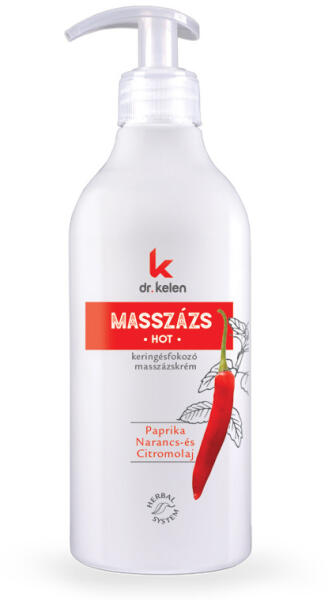 Dr. kelen masszázskrém hot 500 ml Paprika-kivonatot (capsaicin), narancs- és citromolajat tartalmaz. Intenzív vérkeringés- és anyag- cserefokozó hatása helyi vérbőséget, melegérzetet idéz elő a bőrszövetben és az izmokban. Bemelegítés előtt, begyúráshoz, mozgásszervek regenerálására, izmok, ízületek átmelegítésére, reumatikus problémák esetén önmagában ill. fi
