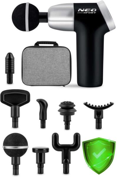 Testmasszázs pisztoly + 8 párna Modell: NS-500 fekete Kényelmes és funkcionális: Könnyű és kényelmes, Akár 8 cserélhető tartozékkal, INGYENES praktikus, elegáns szövetből készült tárolótáska, LCD kijelző, egyszerű lengyel nyelvű használati utasítás. Biztonságos: Ergonomikus kialakítás a könnyű fogásért, túlmelegedés elleni védelem, robusztus beépített akkumul