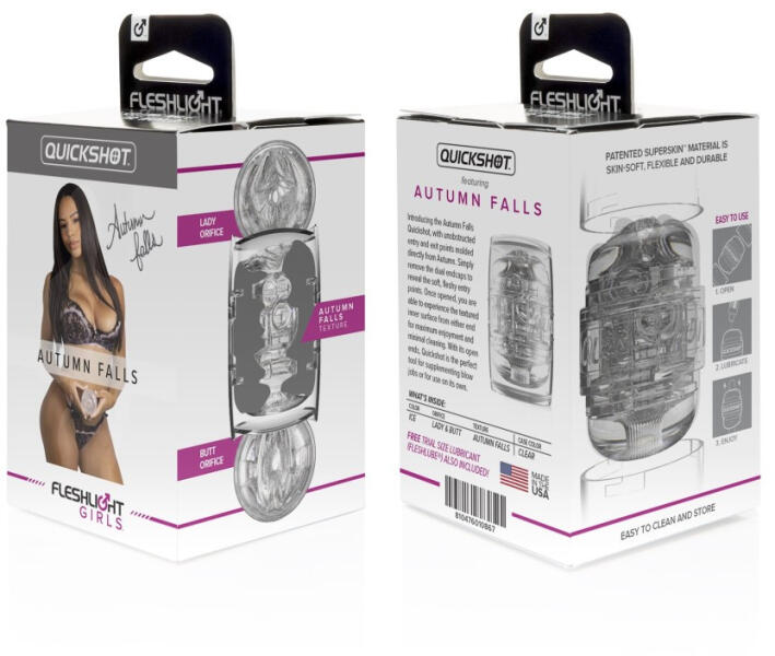Férfiaknak ajánlott, henger alakú, mind a két végén nyitott, Autumn Falls ánuszáról és vaginájáról formázott egyéni erotikus játék. Minden Fleshlight maszturbátor egyedi belső textúrával rendelkezik. Használatával az aktus közbeni önkontroll nagymértékben fejleszthető, így annak ideje jelentősen növelhető. Tisztítása: használat előtt és használat után szappan