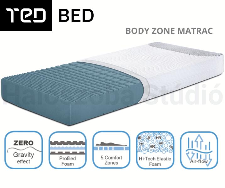 A Body Zone matracot félkemény fekvőfelületet kedvelőknek ajánljuk. A 2 oldal, különböző profilú és érzetű. 5 kényelmi zónára, osztott 20 cm magas HR hab. Kiváló szellőzés. Gépi mosásra alkalmas, levehető matrachuzat. Zöld termék: 100%-ban újrahasznosítható.