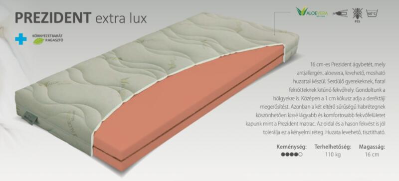 A Prezident Extra lux 12 komfortosabb változata ez a 16cm-es ágybetét. A kemény fekvőhelyet kedvelőknek ajánlott. Nagy sűrűségű PUR-habból és 1 cm-es kókuszból készülő, természetes anyagokat is tartalmazó, nagy terhelésnek kitehető ágybetét. Kifejezetten jól terhelhető, és strapabíró matrac. Elsősorban serdülő gyermekeknek és fiatal felnőtteknek ajánljuk. Terhelh