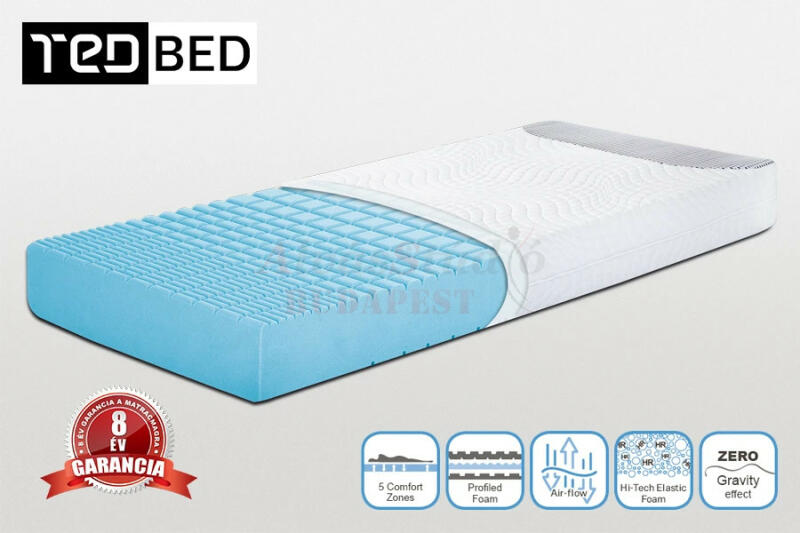 5 kényelmi zónával ellátott új fejlesztésű Hi-Tech Elastic hideghab matrac, két oldalán eltérő keménységgel. A matrac megfordításával könnyen lehet változtatni a fekhelye alváskomfortján. Feszes alátámasztás. A TED Body Zone 5 kényelmi zónával ellátott új fejlesztésű Hi-Tech Elastic hideghab matrac . A két oldalán eltérő keménység lett kialakítva modern lézere