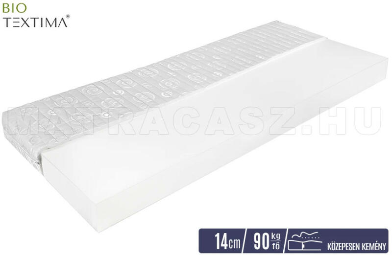 A Bio-Textima BASIC Alaska WAVE 14 cm vastag, közepesen kemény, vákuumcsomagolt hideghab matrac monozónás habból készült magrésze anatómiailag megfelelő gerinctámaszt nyújt. Ideális választás azok számára, akik közepesen kemény fekvéskomfortot keresnek belépő szintű árkategóriában, és testsúlyuk nem haladja meg a 90 kilogrammot. A Bio-Textima BASIC Alaska WAVE 14 cm va
