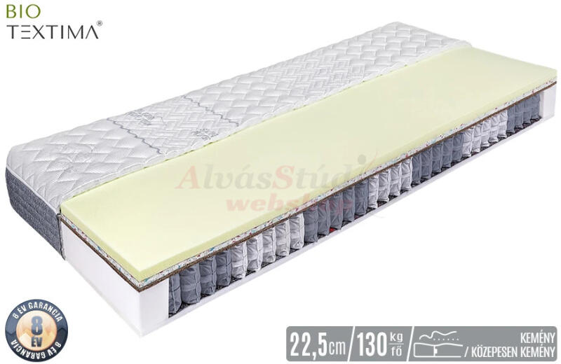Közepesen kemény, 22,5 cm magas Bio-Textima PRIMO Admiral MEMORY 7 zónás táskarugós matrac memóriahabos kényelmi réteggel, nedvesség és hőszabályozó, antiallergén huzatban. A memóriahab különleges nyomásmentesítő tulajdonsága révén kiválóan alkalmazkodik a test formájához és egyenletes alátámasztást nyújtva tehermentesíti a csigolyákat és az izmokat. A felső me