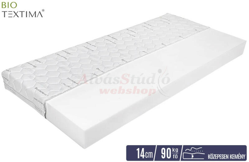 A Bio-Textima BASIC Bayscent LINE 14 cm vastag, közepesen kemény, vákuumcsomagolt hideghab matrac monozónás habból készült magrésze anatómiailag megfelelő gerinctámaszt nyújt. Ideális választás azok számára, akik közepesen kemény fekvéskomfortot keresnek belépő szintű matrac kategóriában, és testsúlyuk nem haladja meg a 90 kilogrammot. A Bio-Textima BASIC Bayscent LINE