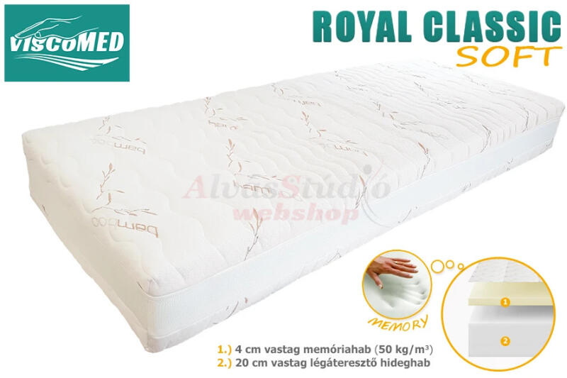 ViscoMed Royal Komfort SOFT memory matrac felső kényelmi rétege 6 cm vastag (50 kg/m 3 ) memóriahab, melynek optimális alakfelvevő képessége eloszlatja a testet érő felületi nyomást megakadályozva a nyomáspontok kialakulását. Főleg oldalt és vegyes alvástípushoz ajánljuk. Alsó tartómagja 20 cm vastag formatartó hideghab (35 kg/m 3 ). Többféle kiváló minőségű, moshat