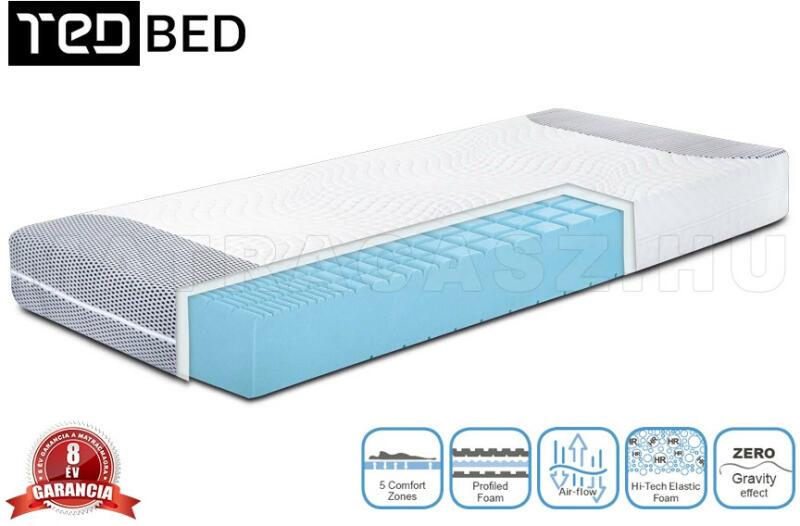5 kényelmi zónával ellátott új fejlesztésű Hi-Tech Elastic hideghab matrac, két oldalán eltérő keménységgel. A matrac megfordításával könnyen lehet változtatni a fekhelye alváskomfortján. Feszes alátámasztás. A TED Body Zone 5 kényelmi zónával ellátott új fejlesztésű Hi-Tech Elastic hideghab matrac . A két oldalán eltérő keménység lett kialakítva modern lézere