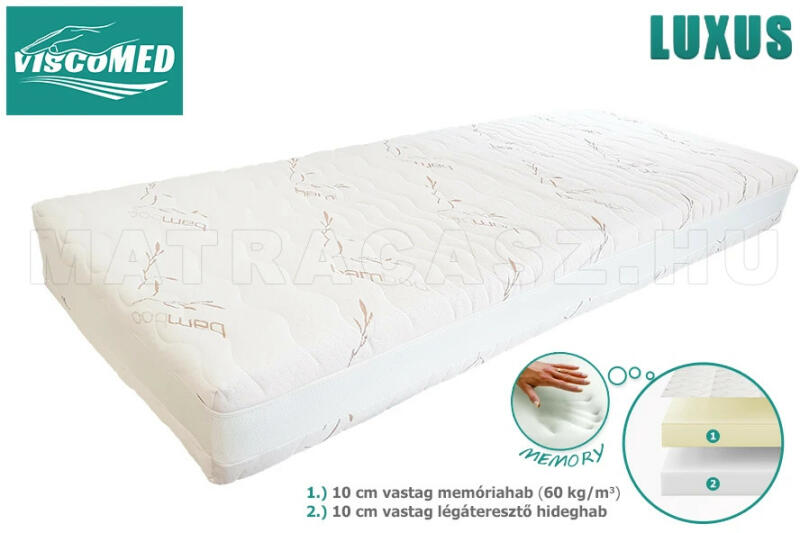 Kényeztető puhaság élménye 10 cm vastag nagy sűrűségű (60 kg/m3) memóriahabnak köszönhetően. Az alátámasztó réteg 10 cm vastag nagy teherbírású minőségi hideghab. AloeVerás huzata mosható. A ViscoMed Luxus memory matrac maga a tökéletes puhaság és kényelem. 10 cm vastag felső kényelmi rétege nagy sűrűségű valódi memóriahab (60 kg/m 3 ) , mely kiváló nyomásc