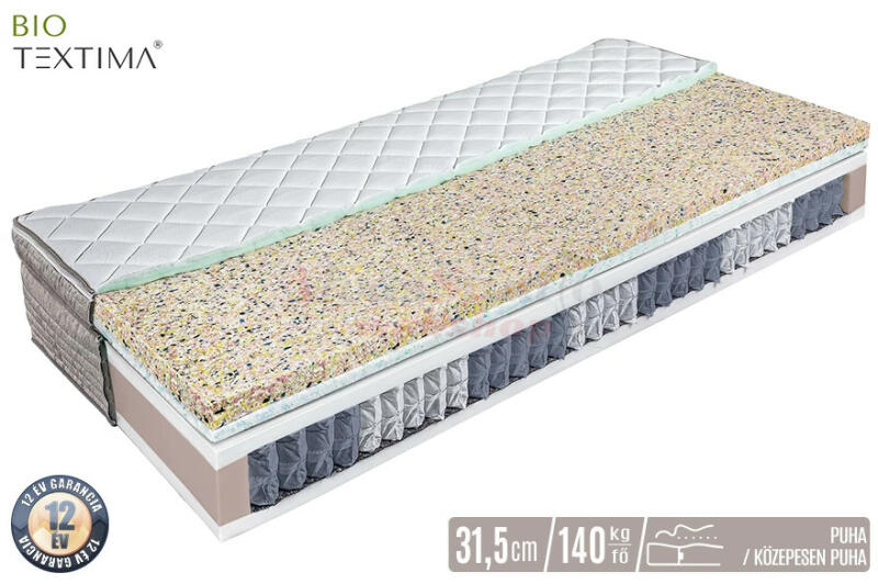 A Bio-Textima BASIC Bayscent LINE 14 cm vastag, közepesen kemény, vákuumcsomagolt hideghab matrac monozónás habból készült magrésze anatómiailag megfelelő gerinctámaszt nyújt. Ideális választás azok számára, akik közepesen kemény fekvéskomfortot keresnek belépő szintű matrac kategóriában, és testsúlyuk nem haladja meg a 90 kilogrammot. A Bio-Textima BASIC Bayscent LINE