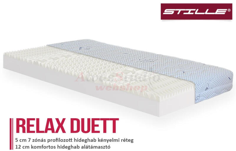 A Stille Relax Duett félkemény, 7 zónás hideghab matrac kényelmes fekvéskomforttal és levehető, 40 °C fokon mosható Silver huzattal. Stille Relax Duett matrac felépítése: - 5 cm magas 7 zónás, test vonalát követő hideghab - 12 cm magas keményebb tartóhab Matrac huzata: Antiallergén Silver huzat, levehető, 40 °C-on mosható. Matrac teherbírás: 120 kg. A Stille Relax Duett f