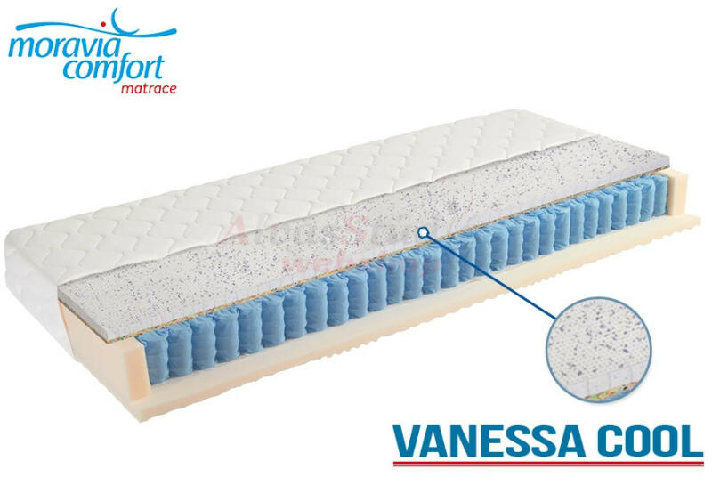 Vanessa félkemény táskarugós ágybetét 7 ergonómiai zónával. 6 cm vastag, 35 kg/m3 tömegsűrűségű, speciális formavágásokkal kialakított hideg-hab kényelmi rétege szárazabb alvási klímát biztosít. 4 cm vastag, különleges Cool Latex réteg. 60°C-on mosható, körbe cipzározható, exkluzív megjelenésű SANITIZED huzat A Moravia vállalat termékei a bizalom és a legmaga