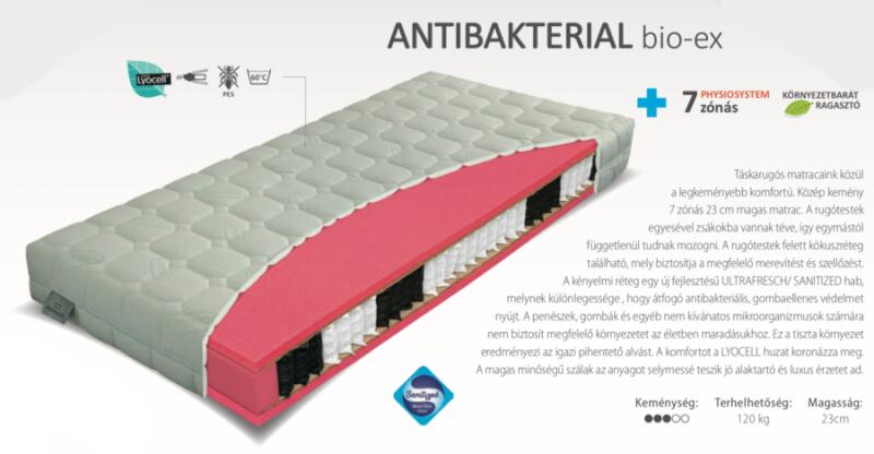 Az Antibakterial Bio-Ex ágybetét egy félkemény-kemény 7 zónás, 23 cm magas táskarugós matrac, a rugótestek feletti kókuszréteggel a megfelelő merevítés és szellőzés érdekében. A kényelmi réteget a 3-3 cm-es ULTRAFRESCH-SANITIZED hab biztosítja, mely átfogó antibakteriális és gombaellenes védelmet nyújt. 120 kg-ig terhelhető. A komfortot a Lyocell huzat koronázza meg.
