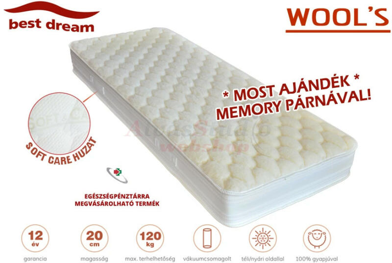Termék részletekA Best Dream Wool's téli -nyári oldalas vákuummatrac kiváló tartást nyújt a testnek a rugalmasságának köszönhetően, miközben nem korlátozza az izmokat vagy a vérkeringést . A formatartó tulajdonsága optimális pihenést biztosít a test számára és teljes kényelmet nyújt. A matrac téli oldalához 100% merinói gyapjú réteg van steppelve, ami kiválóan tartja a meleget és