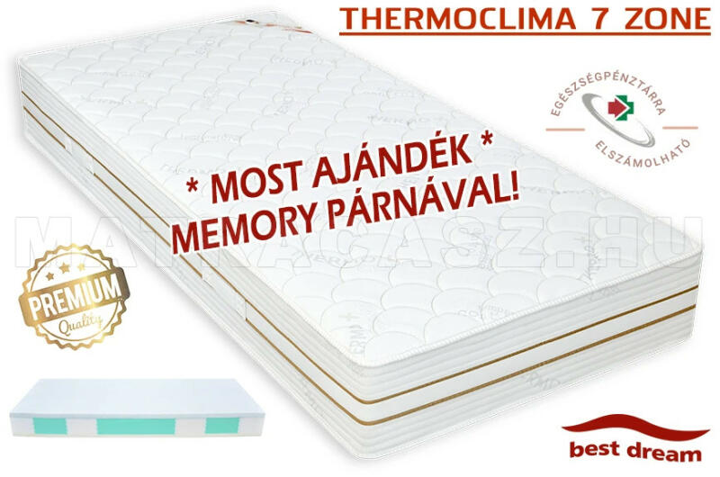 A Best Dream Thermoclima 7 Zone" prémium kategóriás matrac 7 anatómiai zónára osztott téli-nyári oldalas ágybetét, mely kiválóan ötvözi a Memóriahab, - Hideg-hab, - Latex Blue Gel lapanyagokat. A zónák a fejtől kezdődnek, anatómia szerint a vállnál, térdnél, bokánál könnyítve, míg a csípőnél (ami a legnehezebb testrészünk) erősítve vannak. A maximális kényelem