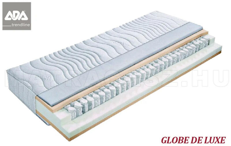 Globe De Luxe nagy rugalmasságú táskarugós matrac hordó formájú zsebrugós matracmaggal, testkímélő váll- és medence zónával, poliéterhab párnázóréteggel. Elasztikus, dupla rétegű "Silver Guard" huzat, nedvességszabályozó és légáteresztő üreges klímaszál töltettel, valamint 4 oldalon cipzárral, forgatófülekkel a könnyebb kezelhetőség érdekében. Allergiások