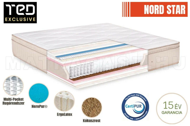 Multipocket i-Springs Super Comfort technológiával gyártott táskarugós matrac progresszív alátámasztással. Lecipzározható felső kényelmi-rétegben elhelyezett nanopocket rugók, és a több rétegben elhelyezett első osztályú anyagok hibrid konstrukciója 4 különböző keménységet és kényelmet képes megvalósítani. Nord Star, exkluzív, multipocket táskarugó rendszerű ma