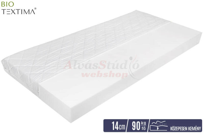 A Bio-Textima BASIC Pure WHITE 14 cm vastag, közepesen kemény, vákuumcsomagolt hideghab matrac monozónás habból készült magrésze anatómiailag megfelelő gerinctámaszt nyújt. Ideális választás azok számára, akik közepesen kemény fekvéskomfortot keresnek belépő szintű matrac kategóriában, és testsúlyuk nem haladja meg a 90 kilogrammot. A Bio-Textima BASIC Pure WHITE 14 cm