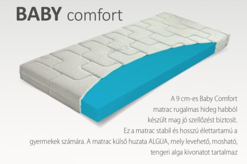 A 9 cm-es Baby Comfort matrac rugalmas hideg habból készült mag jó szellőzést biztosít. Ez a matrac stabil és hosszú élettartamú a gyermekek számára. A GREENFIRST huzat védelmet nyújt az atkák és a baktériumok ellen. 60 ° C-on mosható. Ez a matrac nem tartalmaz ragasztót, mert a matrac magja egyetlen hideghab-blokk alkalmazásával készült. Gyermekek számára alkalmas és n