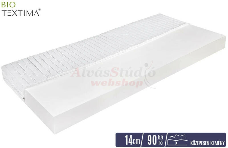 A Bio-Textima BASIC Soft LINE 14 cm vastag, közepesen kemény, vákuumcsomagolt hideghab matrac monozónás habból készült magrésze anatómiailag megfelelő gerinctámaszt nyújt. Ideális választás azok számára, akik közepesen kemény fekvéskomfortot keresnek belépő szintű matrac kategóriában, és testsúlyuk nem haladja meg a 90 kilogrammot. A Bio-Textima BASIC Soft LINE 14 cm va